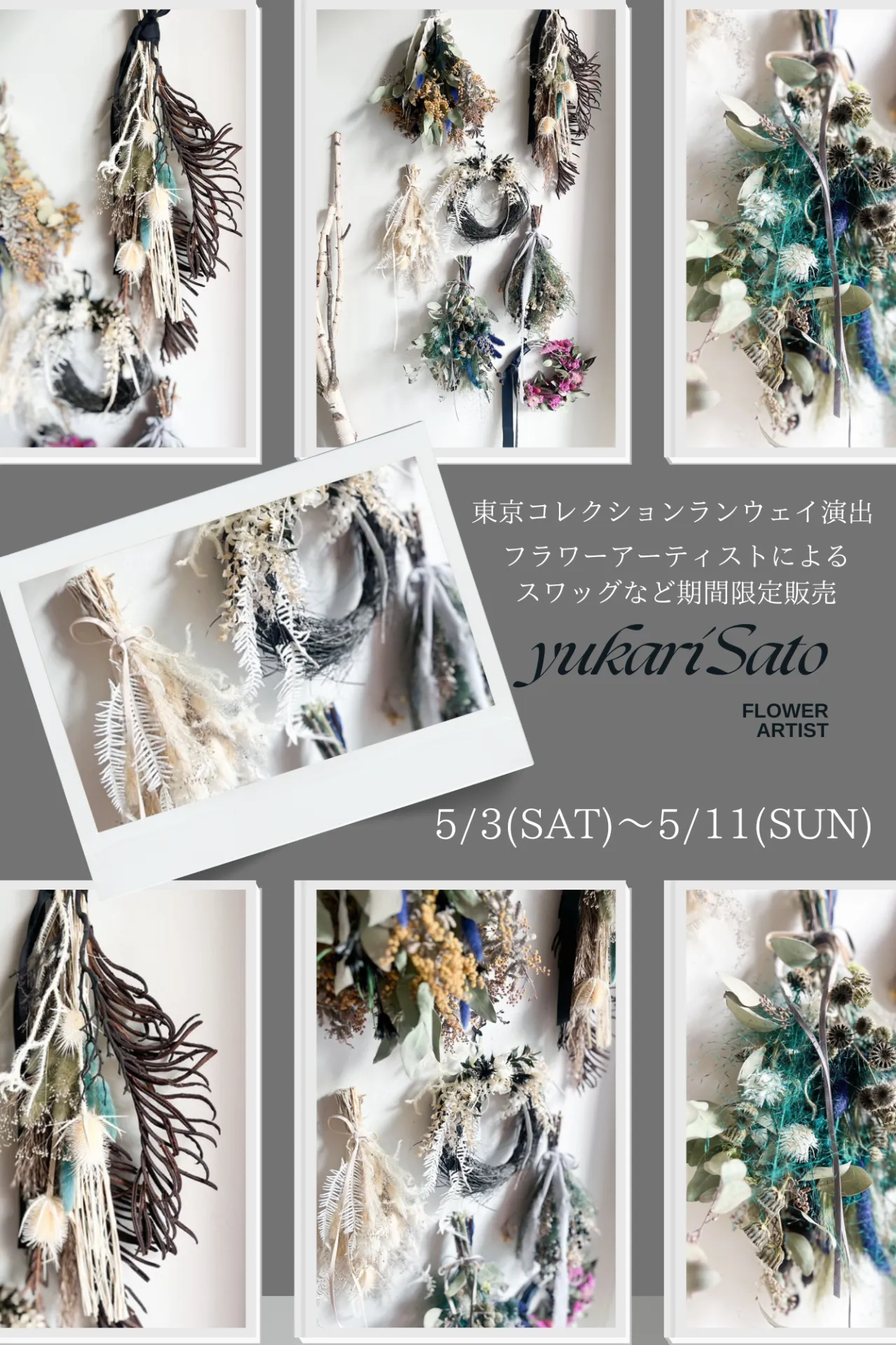 ゴールデンウィーク限定イベント第3弾東京コレクションなどで装飾を手がけた事のあるフラワーアーティスト「YukariSato」が作ったスワッグなどを5/3(SAT)~5/11(SUN)まで限定イベントを行います。ご自宅…