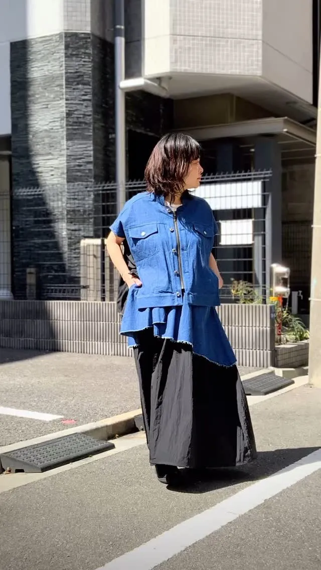 〜デニムで夏らしさ&涼しさ〜2025年夏の新作デニムドッキングセットアップコーデ・スカートの裾はバルーンに変化します・トップスの裾も絞れます・重ね着してトップスの前を開けて着てもよし・風を通す…
